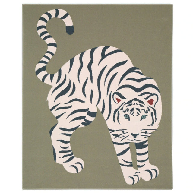 Calling all jungle adventurers—there’s been a majestic white tiger sighting! But no need to panic—this one is soft, cozy, and ready for cuddles. With a playful, lounging pose on a rich teal backdrop, this charming tiger rug adds a touch of wild imagination to any children's bedroom rug setup.