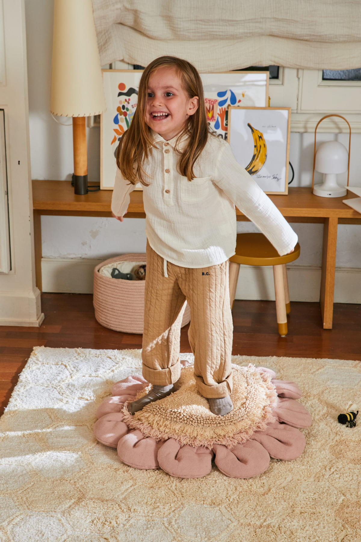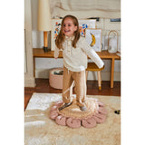 A charming floral-inspired accent, this soft cotton floor cushion adds a touch of whimsy and coziness to any space. Designed in a daisy shape, it features large pink cotton canvas petals surrounding a tufted golden chenille center, which is crafted with a mix of textures for a realistic flower-like effect.
