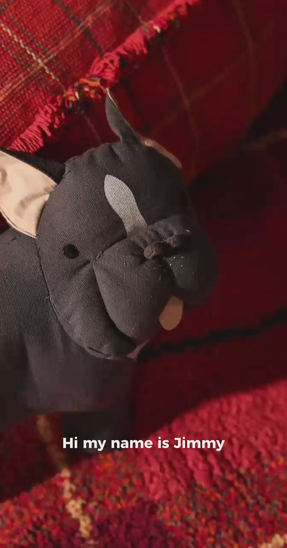 Meet Jimmy! Your perfect little companion. This handcrafted, funny cushion is shaped like a real French Bulldog, made from soft cotton fabric with a light grey print.