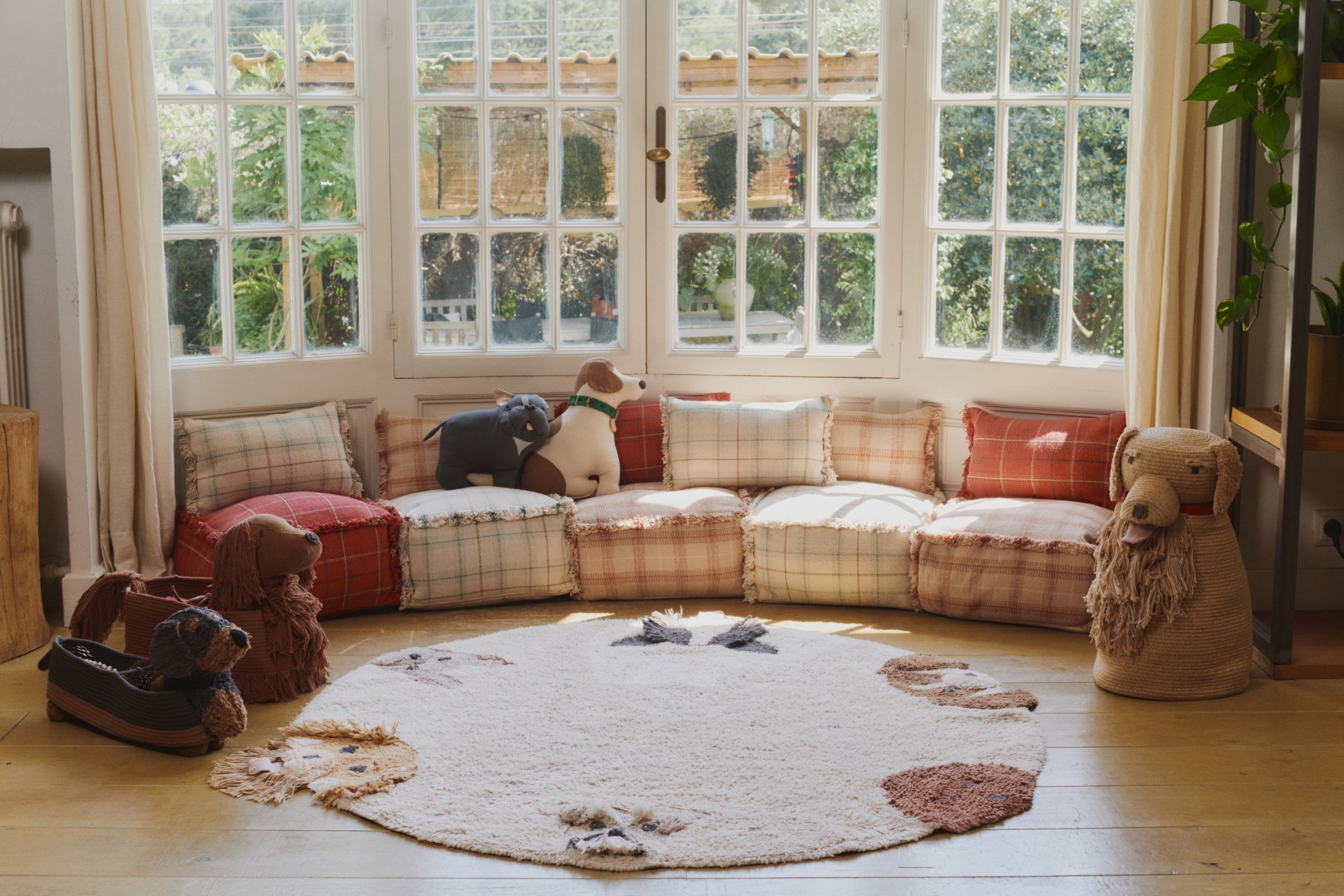 A cozy little cushion with a British twist! Handwoven using traditional looms and dressed in a warm Maple Red. Its fringed edges add a playful touch, perfect for styling your little one’s room.