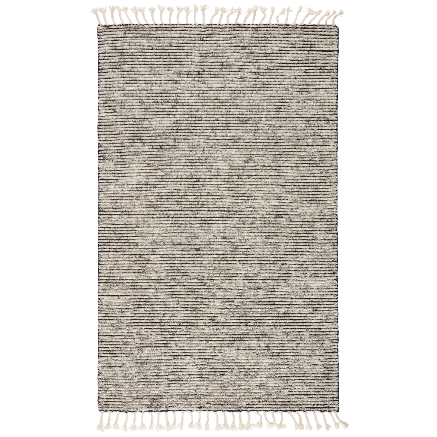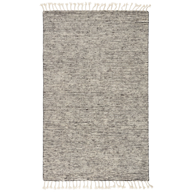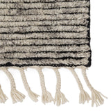 This striped area rug brings warmth and comfort to any indoor space, crafted from durable wool that’s hand-knotted onto a cotton foundation. The heathered design in neutral shades of gray and white creates a sophisticated and timeless look, perfect for contemporary interiors. The braided fringe adds a touch of boho charm, further enhancing the textural appeal of this luxurious rug.