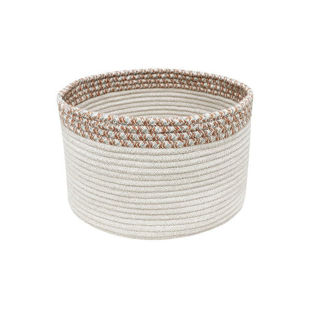 A versatile and eco-friendly storage solution, the Lorena Canals Little Chefs Kilo Toffee Basket is handcrafted using thick braided cords made from recycled PET bottles and cotton. Featuring a natural cord base, this round basket is decorated with contrasting rows in warm Toffee and Vintage Blue for a stylish touch.