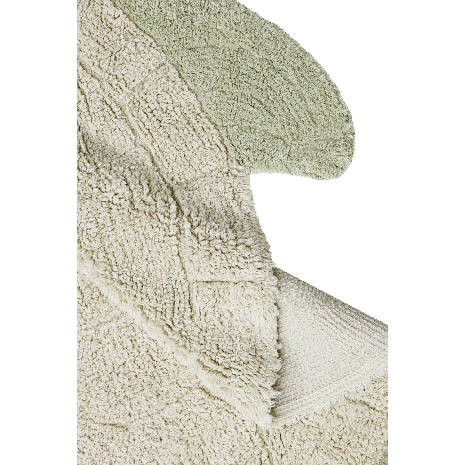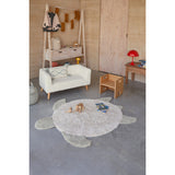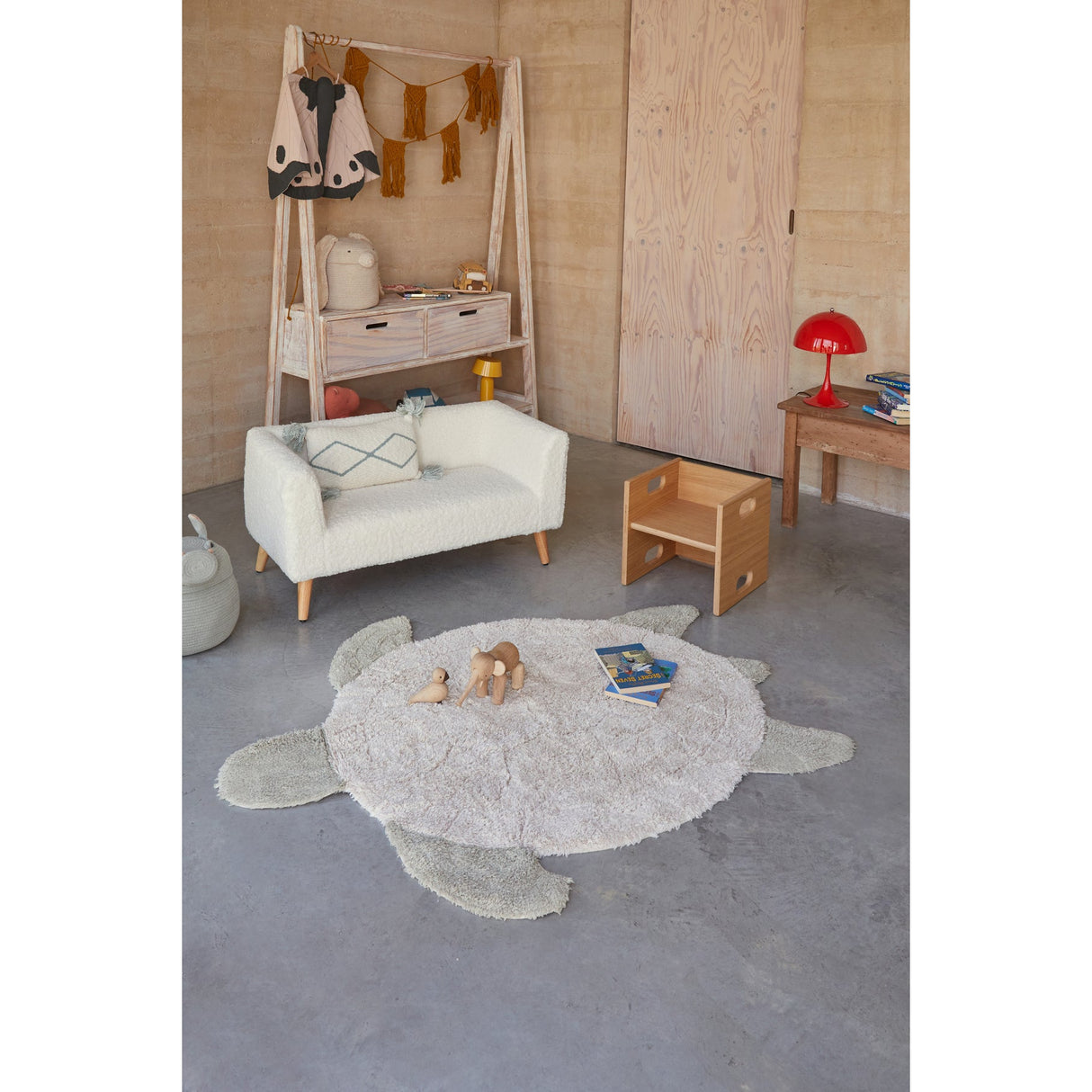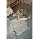 Bring the wonders of the ocean into your child's space! The Lorena Canals Sea Wonders Sea Turtle Washable Play Rug is an adorable, ocean-inspired accent designed to add softness, texture, and a playful touch to any nursery, playroom, or kids' bedroom. This handcrafted cotton rug features a beautifully tufted hexagonal pattern mimicking a turtle’s shell, with high and low piles in natural tones for added depth and dimension. The head, paws, and tail are expertly tufted in olive green, creating an irresistibly charming sea turtle silhouette.