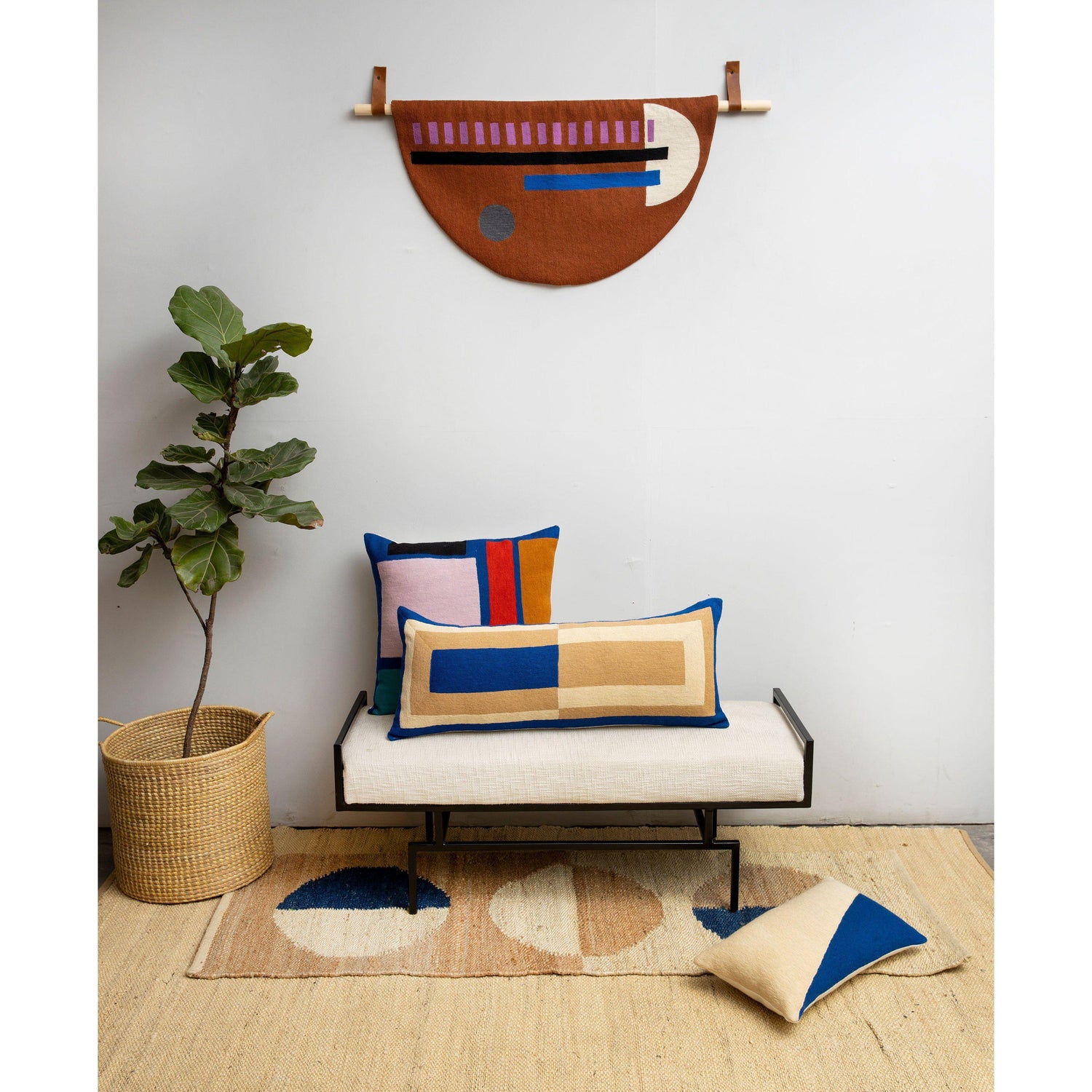 Made with wool embroidery on a cotton canvas backing, this geometric wall art comes with a pine wood dowel and leather loops for easy hanging, making it a versatile and stylish décor piece. Whether displayed in a living room, bedroom, or creative space, this tapestry brings texture, warmth, and a contemporary edge to any interior.