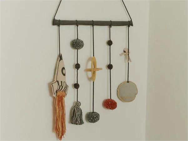 Introduce a cosmic adventure into any room with the Lorena Canals Cosmos Wall Hanger . This handcrafted wall decoration features a charming astronaut made of cord, playful orbits crafted from cotton cords, textile planets with long fringes, and colorful details throughout.