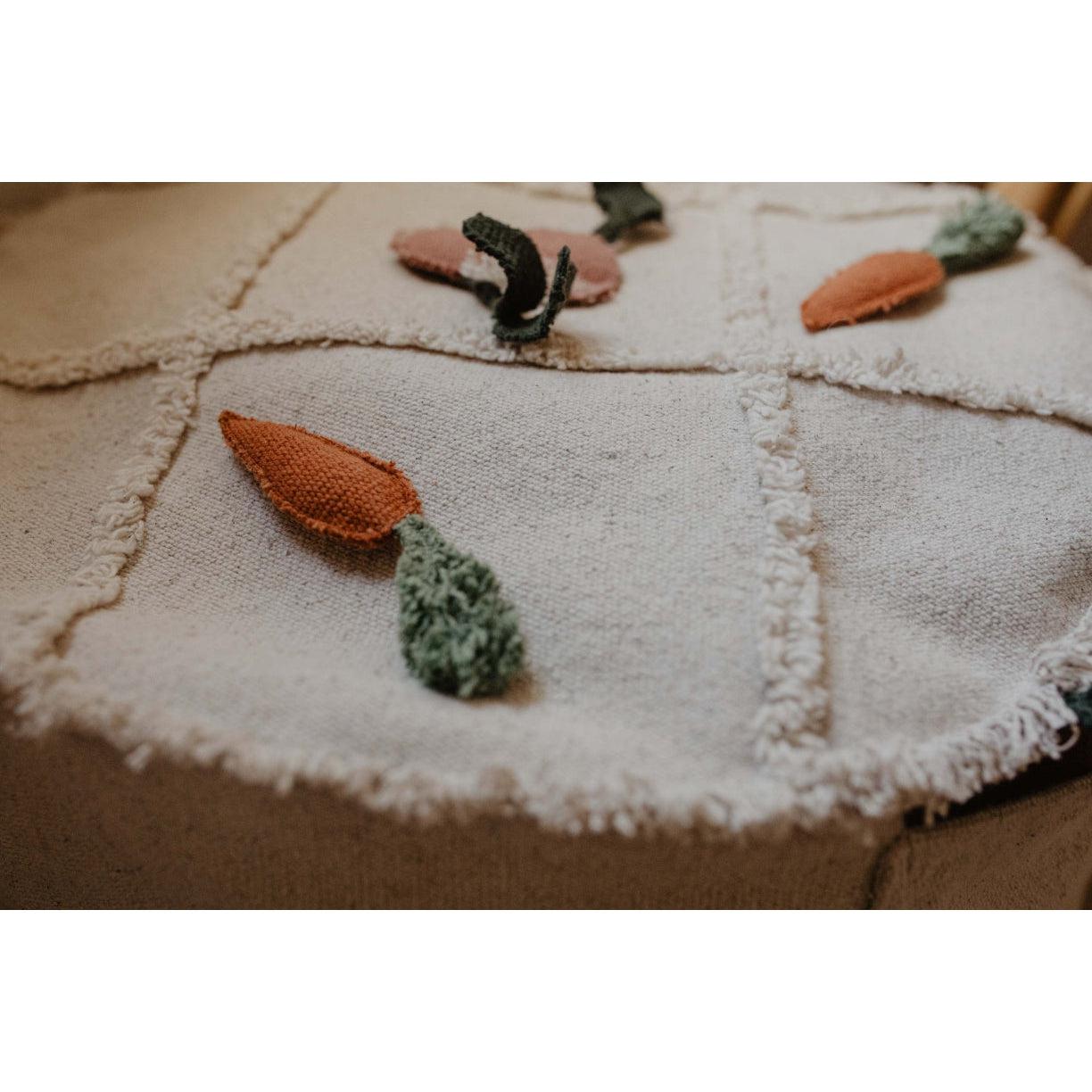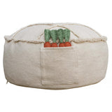 Add a playful touch to any space with this versatile tic-tac-toe pouf, perfect for kids and families. Designed as a fun and functional piece, this handmade cotton pouf features a built-in tic-tac-toe board with soft, plush veggie game pieces, including carrots, broccoli, and radishes. Pockets on the side neatly store the game pieces when not in use, keeping playtime organized. The neutral natural color blends seamlessly with any decor, making it an excellent addition to playrooms, bedrooms, or living spaces.