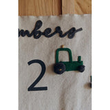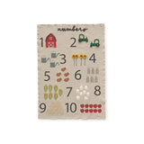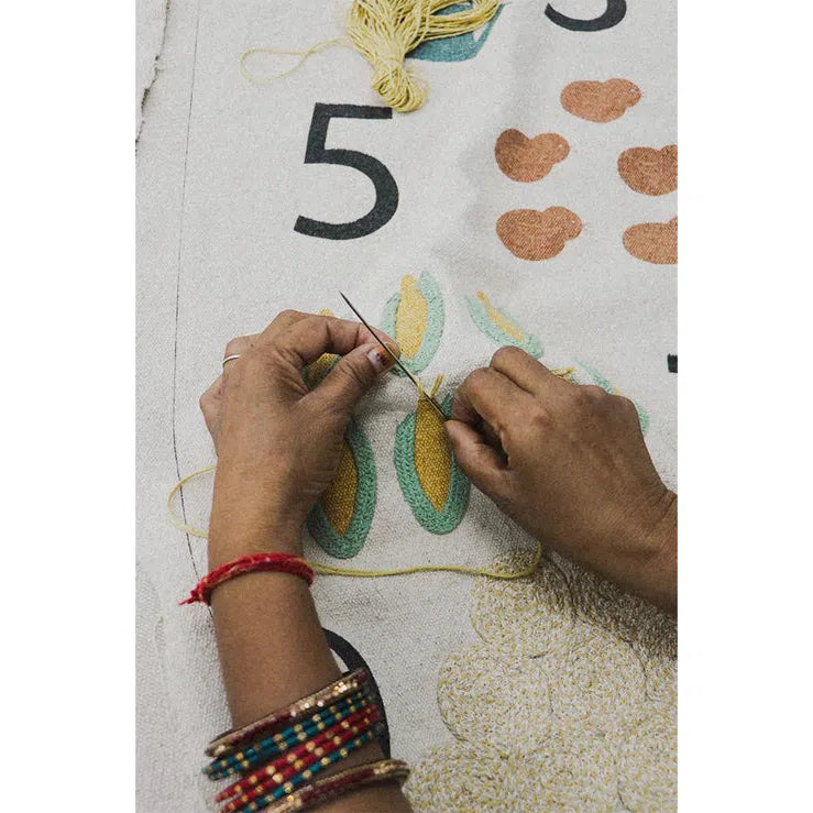 Ready to learn numbers with the Lorena Canals Farm Numbers Wall Hanger. This cotton wall hanger, made from natural canvas, features farm-themed objects and numbers from 1 to 10. With details like fabric, ropes, and fringes that pop from the canvas, this piece is both educational and decorative. It showcases a unique mix of handcrafted techniques for that signature “Lorena” look—embroidery, prints, hand-crafted pompoms, custom-mixed cords, and mini eggs. A true one-of-a-kind creation. Lots of techniques mixed together to give it fun “lorena” look - embroidery, prints, pompoms hand details , mixed cords done only for this product, mini eggs filled with polyester one by one by hand before closing.