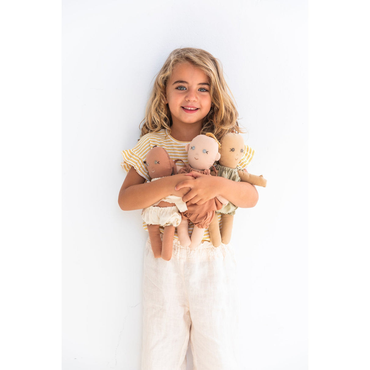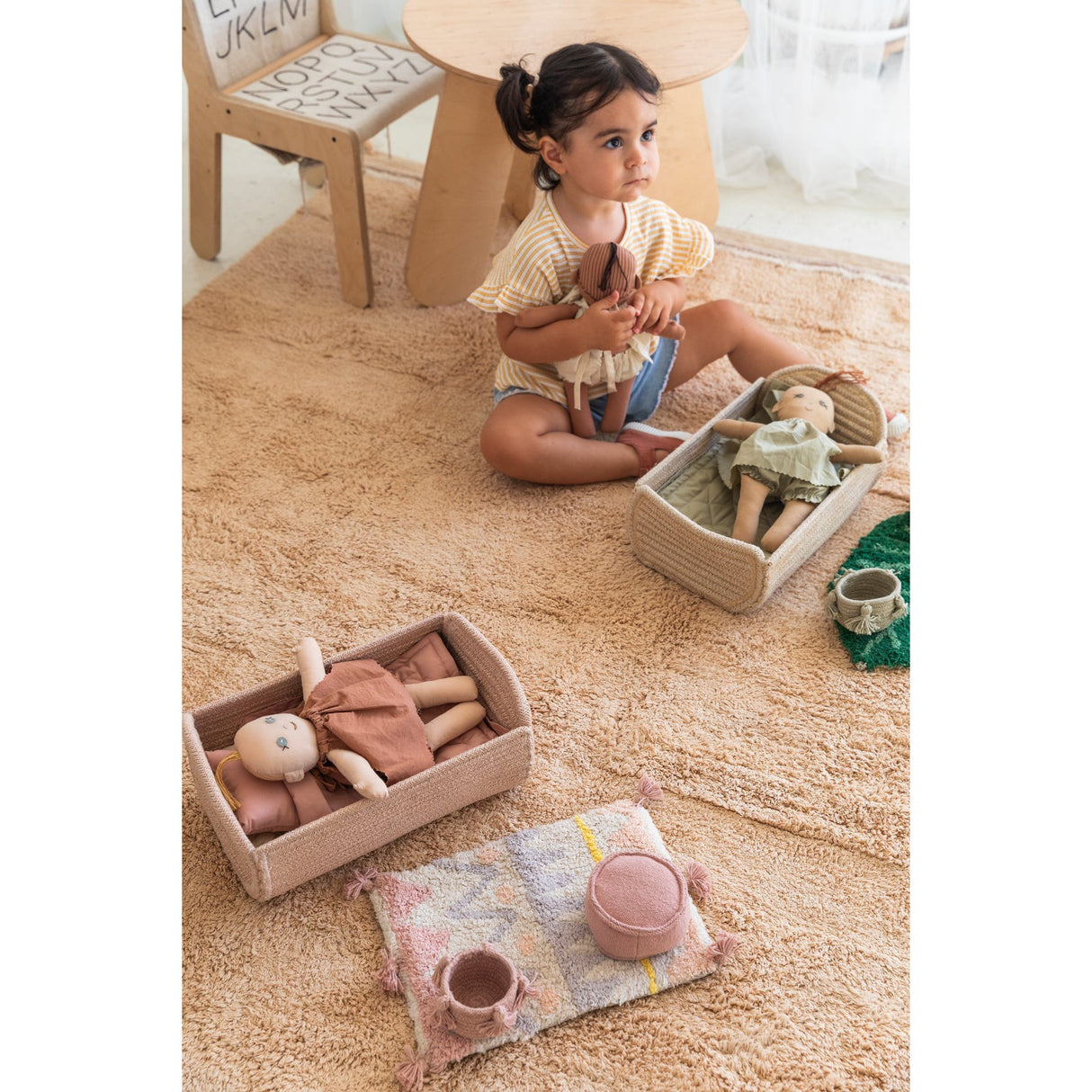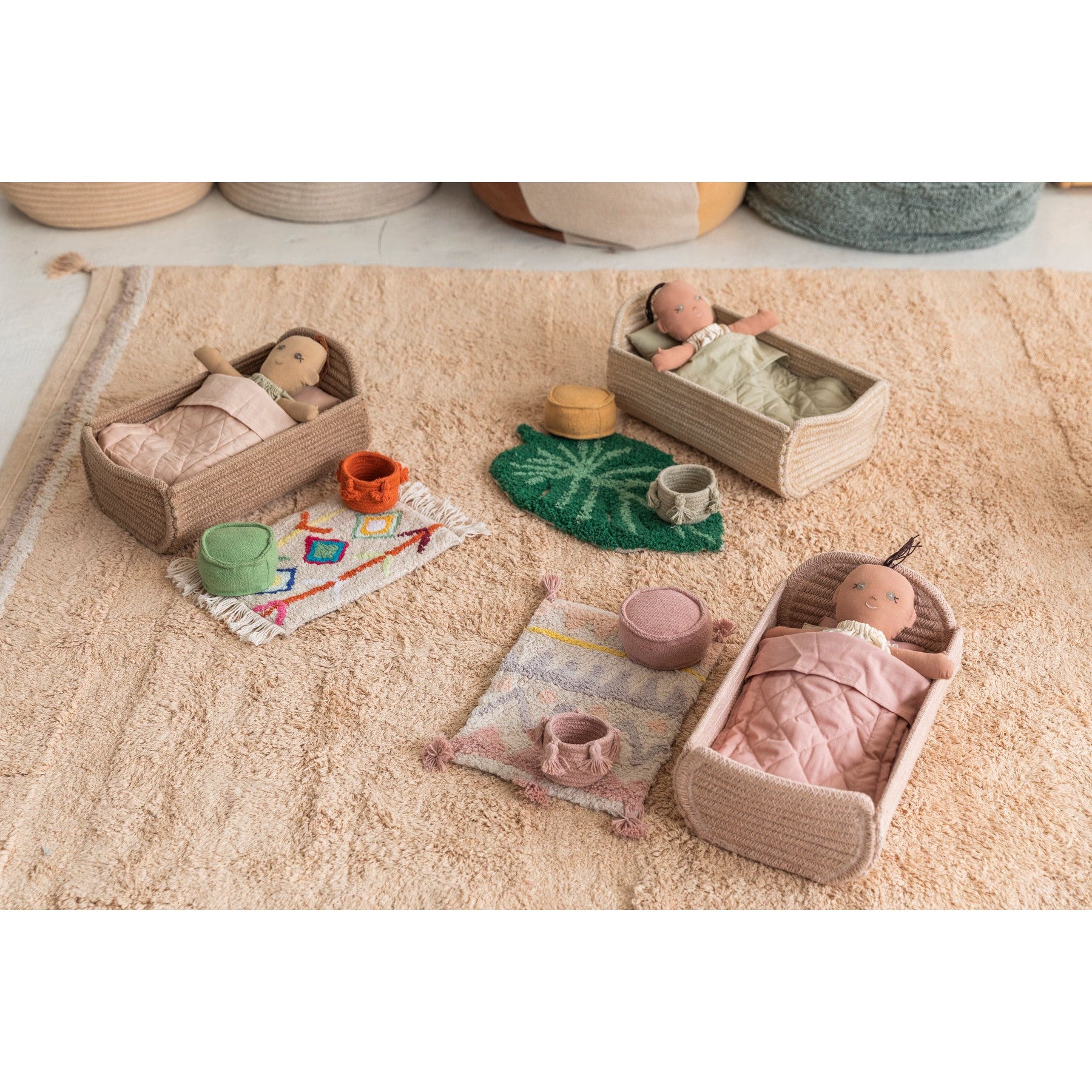 The Lorena Canals Mini Ammi is a charming textile toy set designed to spark creativity and imaginative play. This beautifully crafted set includes a soft fabric doll, a cozy crib with bed linens, and coordinating miniature décor pieces—a rug, pouf, and basket—all inspired by Lorena Canals' bestselling designs.