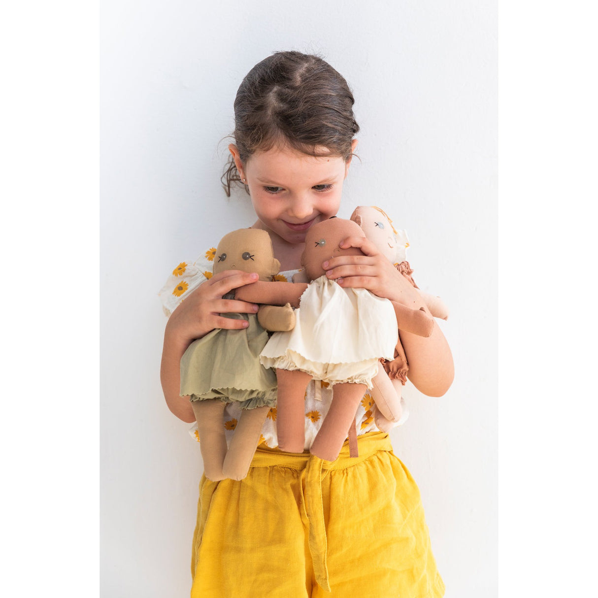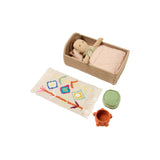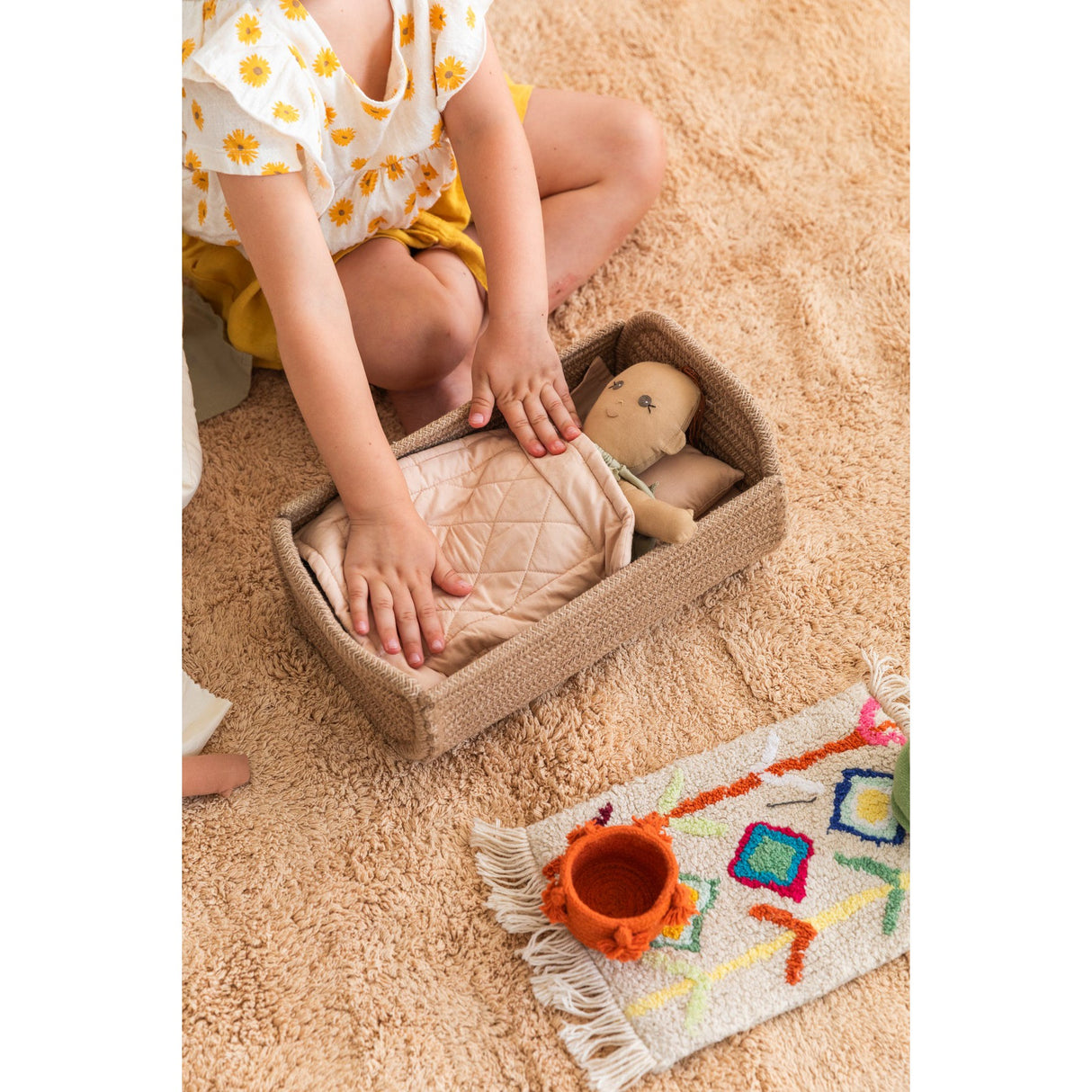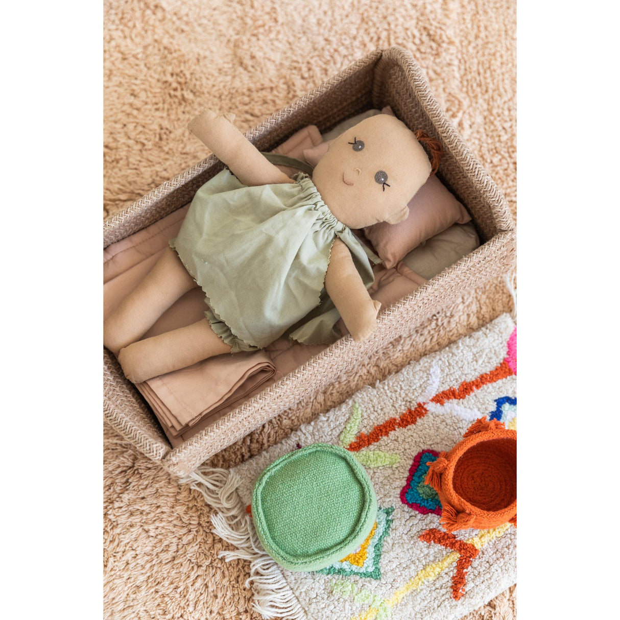 A miniature textile playset designed for endless storytelling, the Lorena Canals Mini Nari set includes a soft doll, a cozy crib with bed linen, and matching decorative pieces inspired by the brand’s bestselling designs. The set features a handwoven mini rug, a pouf, and a basket, all carefully crafted for imaginative play.