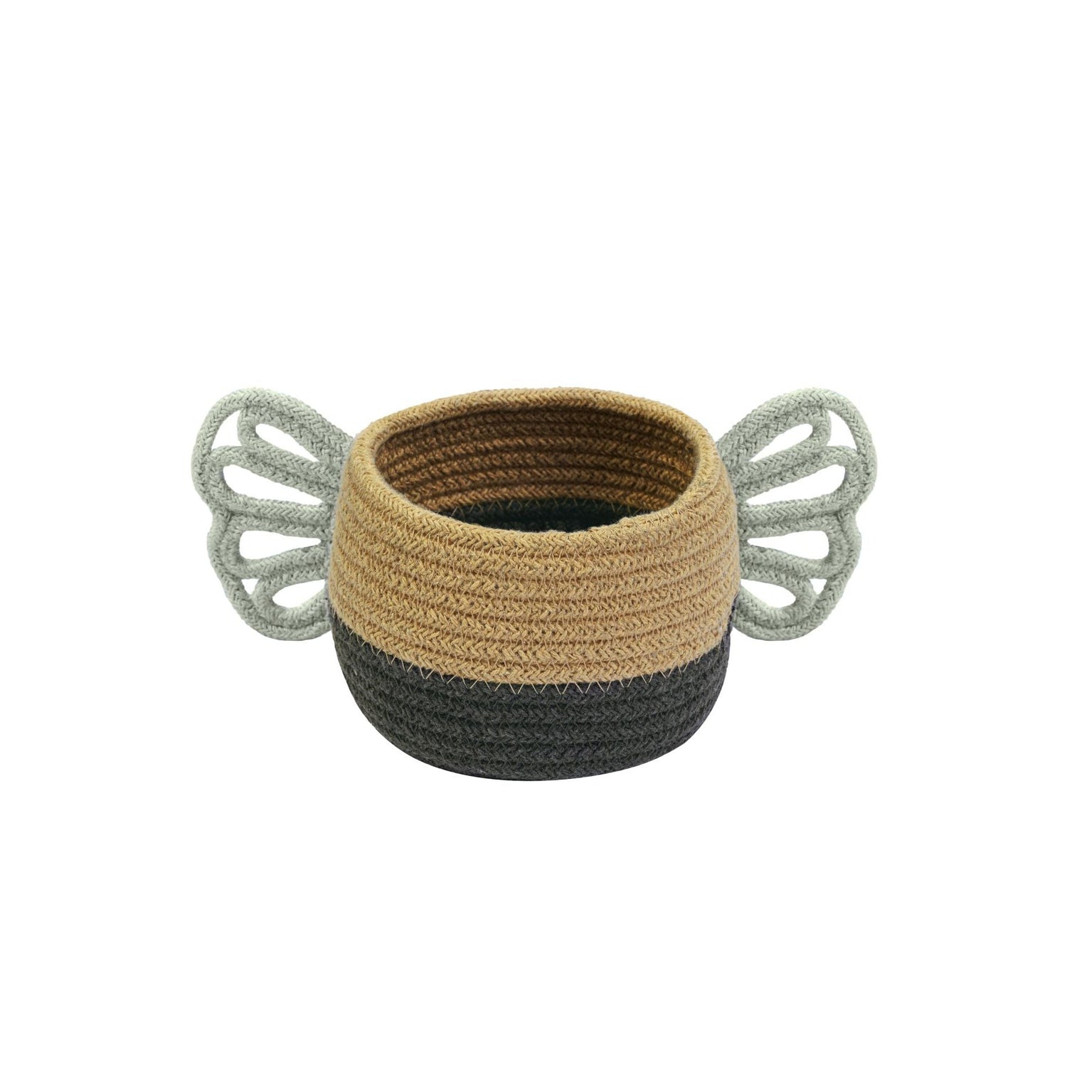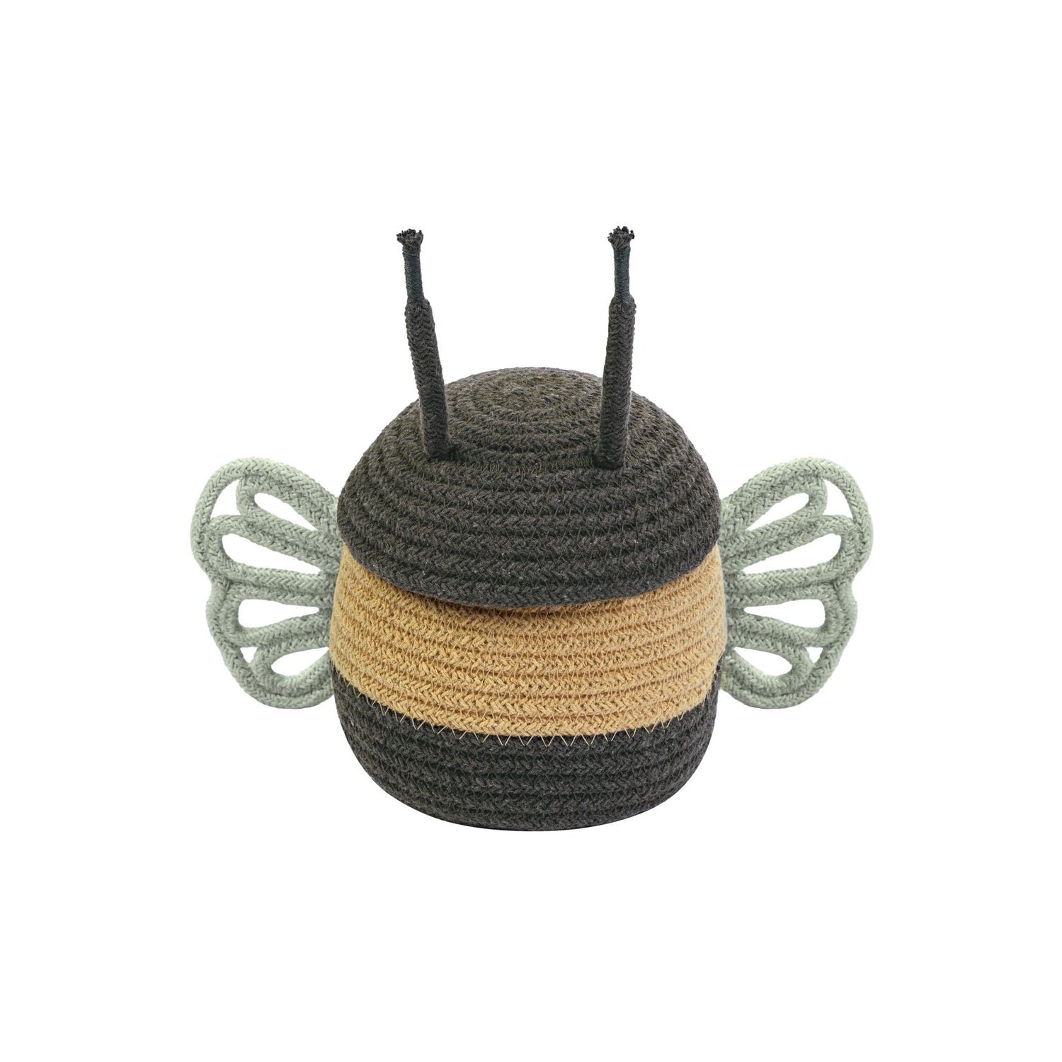 Keep little treasures organized with this adorable bee-shaped storage basket. Handcrafted with dark grey cotton rope and honey-colored accents, it mimics the charming look of a baby bee. Delicate light blue wings and dark grey antennae complete its playful design, making it a delightful addition to any nursery or playroom. Both stylish and practical, this cotton basket brings whimsical charm while keeping essentials neatly stored.