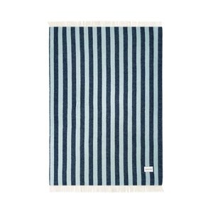 Wrap yourself in the cozy comfort of our New Zealand wool blanket. This beautiful jacquard-woven piece features a sophisticated navy blue and ice blue stripe. The reversible design offers two distinct looks, so you can easily change up your style. Generously sized, it's perfect for relaxing in the living room. Super soft and designed for ultimate comfort, this striped blanket adds a touch of playful style and sustainable warmth to any space.